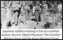 Japan More than sixty years since World War II ended, yet the wounds of Japanese colonialism still fester in East and Southeast Asia. A tragic consequence for women in war zones is sexual violence, exemplified by the “comfort women” of WWII. During the war, Japan sought to improve troop performance by establishing government-mandated prostitution, hoping to reduce rapes and civilian killings. Few women volunteered, leading to the informal “selling” of daughters, kidnapping, and trafficking of women and girls. This paper explores their harrowing experiences, disclosing the impact of such brutal policies.
