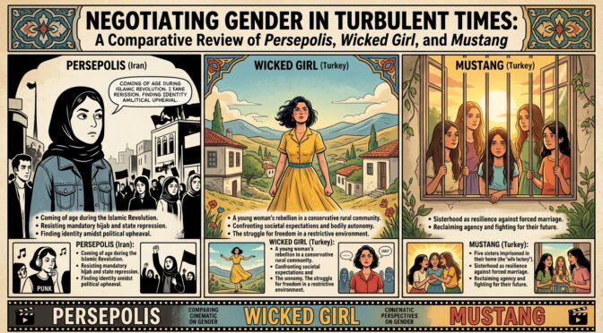 In the diverse cinematic landscape of West Asia, films often serve as mirrors reflecting the intricate interplay of gender roles, societal norms, and political upheavals. This review focuses on three compelling works: Persepolis (2007), an animated autobiographical film directed by Marjane Satrapi and Vincent Paronnaud, depicting a young girl’s coming-of-age amid the Iranian Revolution; Wicked Girl (2017), a Turkish/French animated short with hand drawn frames by Ayçe Kartal, exploring the traumatic aftermath of child sexual abuse; and Mustang (2015), a live-action drama directed by Deniz Gamze Ergüven, portraying five sisters’ resistance against patriarchal constraints in rural Turkey. These films, drawn from Iran and Turkey, illuminate shared gender concerns across the region, including the subjugation of women and girls during periods of social and political transition. By examining how young female protagonists navigate power structures, economic dependencies, and cultural expectations, this comparative analysis highlights the resilience and quiet rebellions that challenge entrenched inequalities, without delving into artistic techniques.