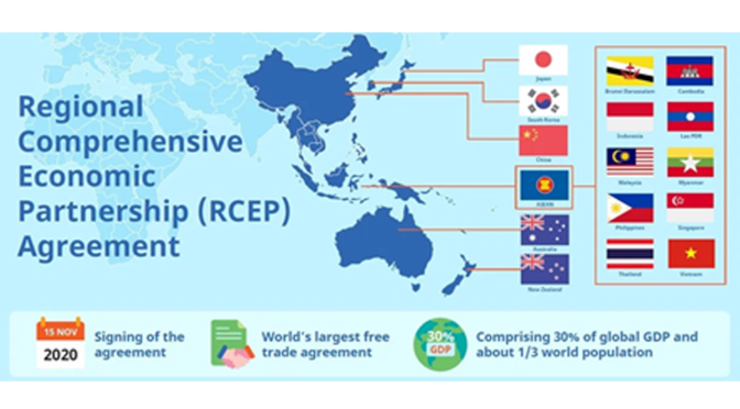 The Regional Comprehensive Economic Partnership is a Free Trade Agreement (FTA) between the ten members of the ASEAN (Indonesia, Thailand, Singapore, Malaysia, Philippines, Vietnam, Brunei, Cambodia, Myanmar and Laos), three additional members (China, Japan, and South Korea), and members with which ASEAN countries have FTA (Australia and New Zealand). It was formally signed on 15 November 2020 to become the largest free trade agreement in history, estimated to represent at least thirty percent of the global gross domestic product. It includes over three billion people, has a combined GDP of approximately $17 trillion, and accounts for about forty percent of international trade.