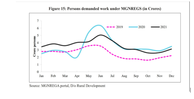 The RE for the scheme has almost always been higher than the BE hence indicating that the demand for guaranteed work always exceeds its supply. In 2020-21, the RE for the Scheme surpassed its BE by a massive ₹50,000 crores, mainly due to the surge in demand for work among the migrant labourers returning to their source States. Despite an actual amount of ₹111,169 crores being spent on the programme in 2020-21, the BE for the next year was kept at ₹73,000 crores. Quite inevitably it was exceeded by the ₹98000 crores of RE, again indicating a surplus of demand. Refusing to respond to this continuous trend, the Centre has yet again kept the BE for the Scheme at a static amount of ₹73000 crores in the 2022-23 Union Budget – a cut back of 25.2% from the RE of the previous fiscal year. The cut backs are highly incongruous to the present reality of the rural labour market. According to the latest Economic Survey 2021-22, during the second wave of the pandemic in India, the demand for the guaranteed employment reached a record high of 4.59 crore individuals in June 2021. Even after adjusting for the seasonality of such trends, the demand is substantially higher than the pre-pandemic levels of 2019.