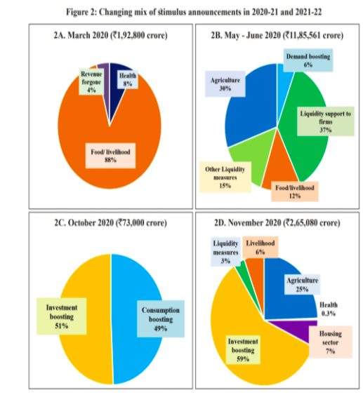 The revenue collection performance of the State is an essential pre-requisite of its ability to finance its expenditures. Moreover, federal structures like that of India in which the annual budgets are integrated with the Planning process, the surplus on the revenue account of the Budget is the first major source of the funds required for capital expenditures. Furthermore, tax must increase at rates greater than that of income growth in order to finance infrastructural investments and social welfare, beyond meeting operational costs. According to the Economic Survey 2021-22, net tax revenue to the Centre, which was expected to grow at 8.5 per cent in 2021-22 BE relative to 2020-21 PA, grew at 64.9 per cent during April to November 2021 over April to November 2020 and at 51.2 per cent over April to November 2019. If social sector saw budget cuts at revised stages of 2021-22 and there wasn’t a revenue shortfall to explain that then where exactly was the augmented tax reserve allocated? In between the beginning of the pandemic in 2020 and December 2021 the GoI announced stimulus packages across different sectors in order to provide relief from the impacts of COVID-19. These announcements were done in 5 phases – March 2020, May to June 2020, October 2020, November 2020, and June to December 2021. In the first, fourth and fifth of these phases in which health sector did receive allocations, the share of its funds vis-à-vis the other sectors was 8%, 0.3%, and 4% respectively. The fiscal policy that the GoI adopted in response to the pandemic was an initial provision of safety nets followed by an exclusive focus on “more productive capital expenditure”, mainly in infrastructure, that are “expected to collectively generate employment and boost output in the medium to long term through multiplier-effects” (Economic Survey 2021-22).