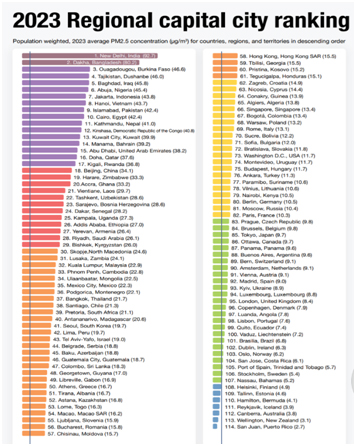 In 2023, Iraq and the United Arab Emirates ranked among the ten most polluted countries globally in terms of PM2.5 concentrations, with levels of 43.8 µg/m3 and 43.0 µg/m3, respectively. Among the top eight polluted cities in West Asia, five are capital cities: Baghdad, Kuwait City, Manama, Abu Dhabi, and Doha, indicating a similar trend as the industrial and/or urban centres of development-boosting countries.