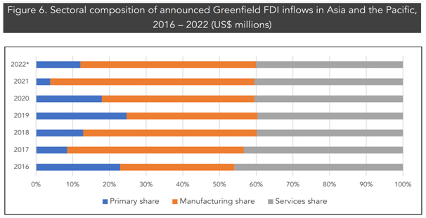 A more recent study by UN ESCAP reports Greenfield investments in the Asia-Pacific have been resiliently growing by 6 per cent in 2022, and more importantly, the share of manufacturing is not only the maximum but has been growing consistently until 2022 when the share saw a slight decrease. Further for the first time, India outpaced China and became the largest destination and source of Greenfield FDI in Asia and the Pacific in 2022, receiving US$ 60 billion of inward Greenfield FDI and being responsible for US$ 35 billion in outward FDI. ASEAN member States attracted the largest share (43 per cent).