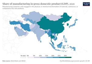 World in Data) Although the time periods differ slightly, the two graphs can be used to correlate the impact of manufacturing (L) -led GDP growth with adverse effects of pollution (R)
