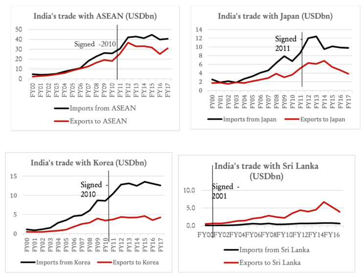 Trade theory has consistently been a strong proponent of free trade of goods and services, labour and capital. However, a growing wave of protectionism and trade has dominated global trade recently. Over the last two decades a rich academic literature examining the removal of trade barriers in developing countries like India, Brazil etc have emerged, enabled due to widespread trade reform across the developing world. This research has shown that trade liberalisation increases aggregate domestic productivity and welfare by reallocating market share from the least to the most productive firms, with the former, exiting the market, and the latter, expanding their businesses. While it is difficult to assess whether the trade war will lead to a significant shift in the global trade paradigm, in the current scenario, India should carefully review existing FTAs before signing new ones. India’s decision to exit the mega trade deal was taken after negotiating the new deal for over 7 years in the backdrop of several unresolved issues concerning market access, existing FTAs, non-tariff barriers faced by Indian exporters, services trade, rules of origin, among others. Evidence from recent FTAs suggests unfavourable gains to India’s trade partners. Working of India’s trade balances with FTA.