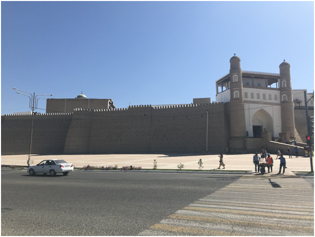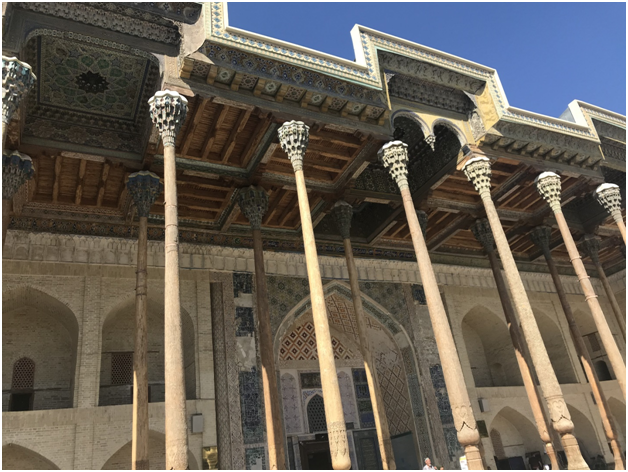 The Bolo Hauz Mosque and the Ark The mosque is a classic example of the Central Asian style of a winter building and a summer avian with ornamental ceiling and wooden columns. To appear taller each column is made up of two joined tree trunks. The Ark isone of Uzbekistan’s oldest structures. This 5th-century, walled fortress-town is right in the centre of Bukhara. It was once the residence of the emirs of Bukhara when it was an emirate state (from 1785–1920)