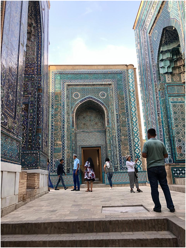 Shahi-i-ZindaMy favorite site in Samarkand, however, was just a 10-minute walk away. It is an extraordinary necropolis of decorated tombs, some of which are more than 1,000 years old. In terms of the sheer intricacies of artistryand shades of blue,this particular complex beat all others hands down. The oldest tombs are from the time of the Arab campaigns to take control of Samarkand by the Prophet’s cousin who was mortally wounded here. The newer tombs are of Timur’s wives and sisters built in the 14th & 15th centuries.